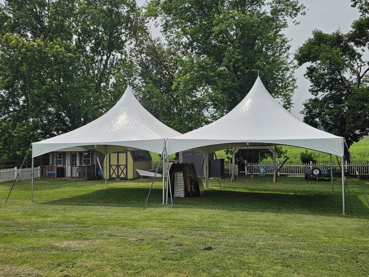 Our 20' x 40' high peak event tent is the perfect solution for your outdoor event, combining style and weather protection. Created by joining two 20' x 20' high peak tents with a rain gutter, this setup ensures your guests stay dry, even in rainy conditions, while providing a spacious and elegant atmosphere.