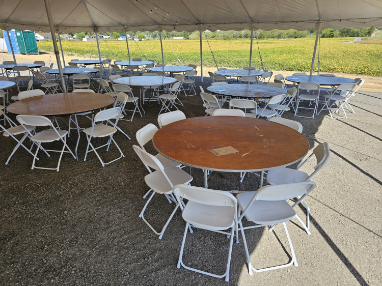 20' x 20' Pole TentThe DIY Package:20' x 20' Pole Tent1Dropdown13139881_27281111100 Introducing our 20x20 Pole Tent in classic white! This tent is perfect for outdoor events such as weddings, parties, and corporate events. Can comfortably seat 32 people. Four tables 8.60" Round Wooden TableThe DIY Package:60" Round Wooden Table1Dropdown83139881_27206051100 Here's a versatile 60 inch round wooden table, a rental gem that brings natural style and practicality to any setting. Its generous, circular design makes it perfect for dining, discussions, or simply creating a welcoming centerpiece for your event.White Folding ChairsThe DIY Package:White Folding Chairs1Dropdown323139881_27206251100 This white folding chair is a versatile seating option that's easy to transport and set up. Its lightweight design and simple fold-away feature make it perfect for gatherings, meetings, or any event where extra seating is needed.